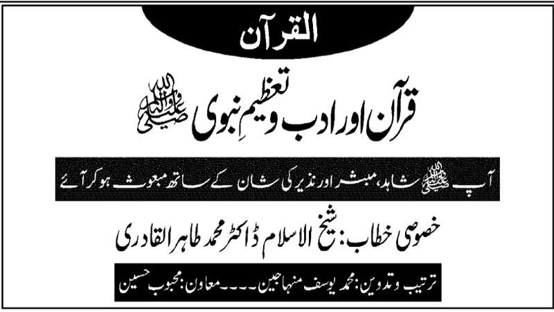 ’’بے شک ہم نے آپ کو (روزِ قیامت گواہی دینے کے لیے اعمال و احوالِ امت کا) مشاہدہ فرمانے والا اور خوشخبری سنانے والا اور ڈر سنانے والا بنا کر بھیجا ہے۔ تاکہ (اے لوگو!) تم الله اور اس کے رسول پر ایمان لاؤ اور آپ (صلی اللہ علیہ وآلہ وسلم کے دین)کی مدد کرو اور آپ (صلی اللہ علیہ وآلہ وسلم ) کی بے حد تعظیم و تکریم کرو، اور (ساتھ) الله کی صبح و شام تسبیح کرو‘‘۔